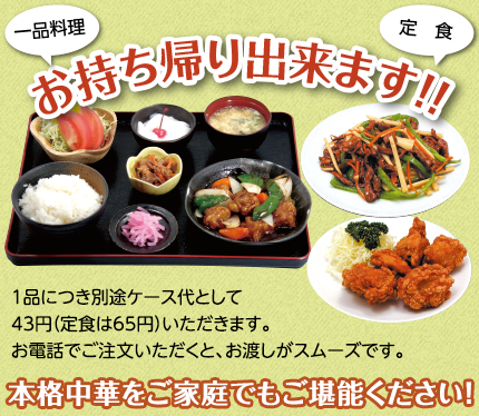 - 本格中華を出前とお持ち帰りでもお楽しみいただけます。
